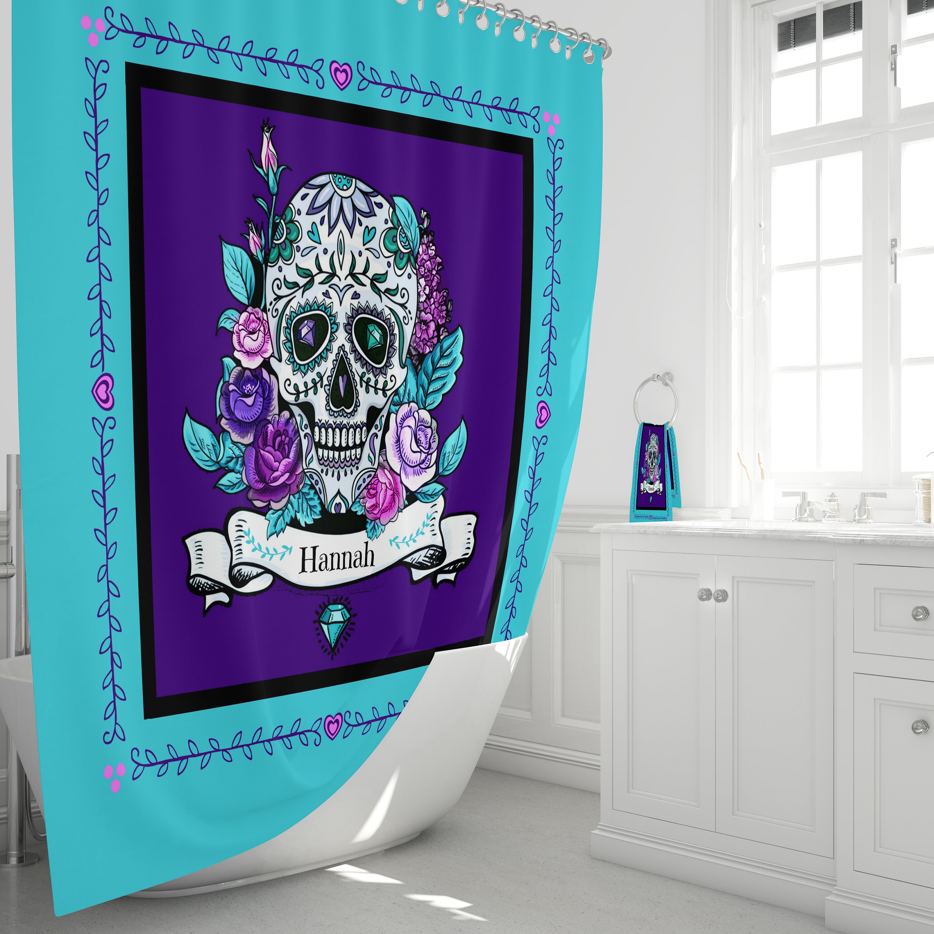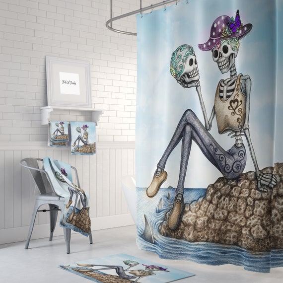 This sugar skull shower curtain with matching towels illustrates that perfectly. Find great designs on shower curtains beach towels duvet covers pillow cases pillow shams.