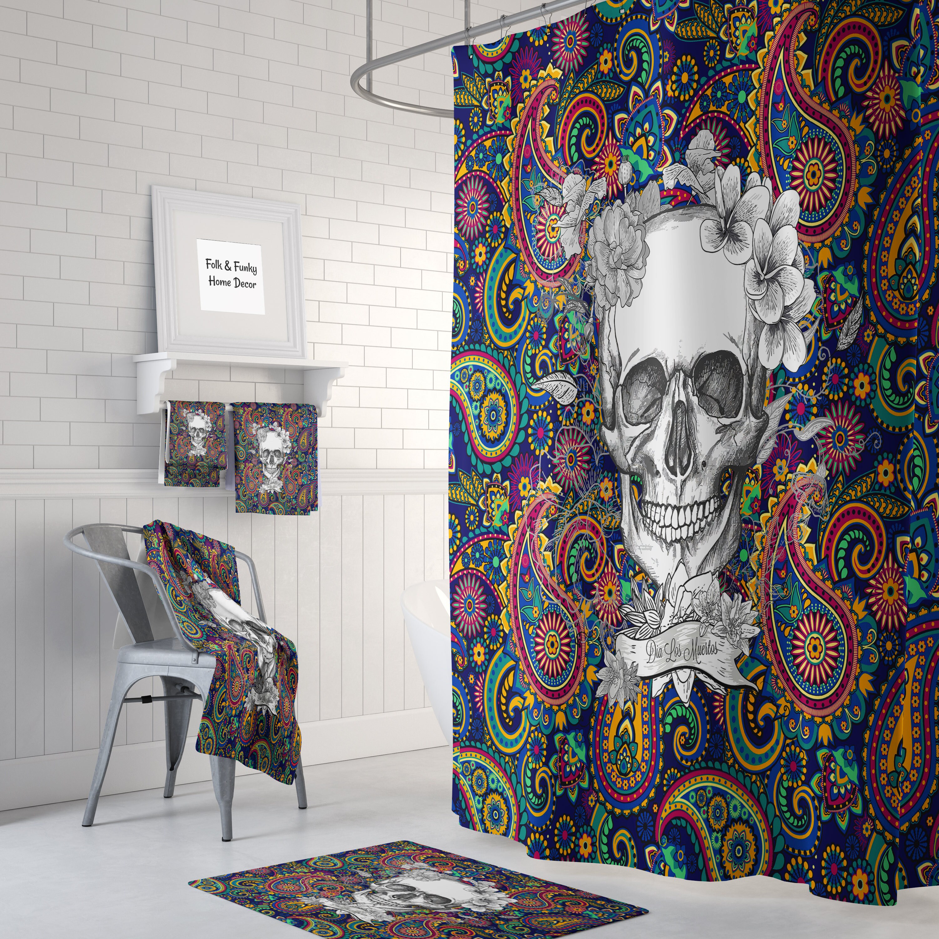 Colorful Sugar Skull Shower Curtain Paisley Skull Bath Etsy